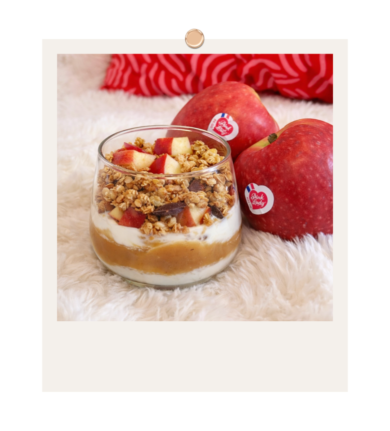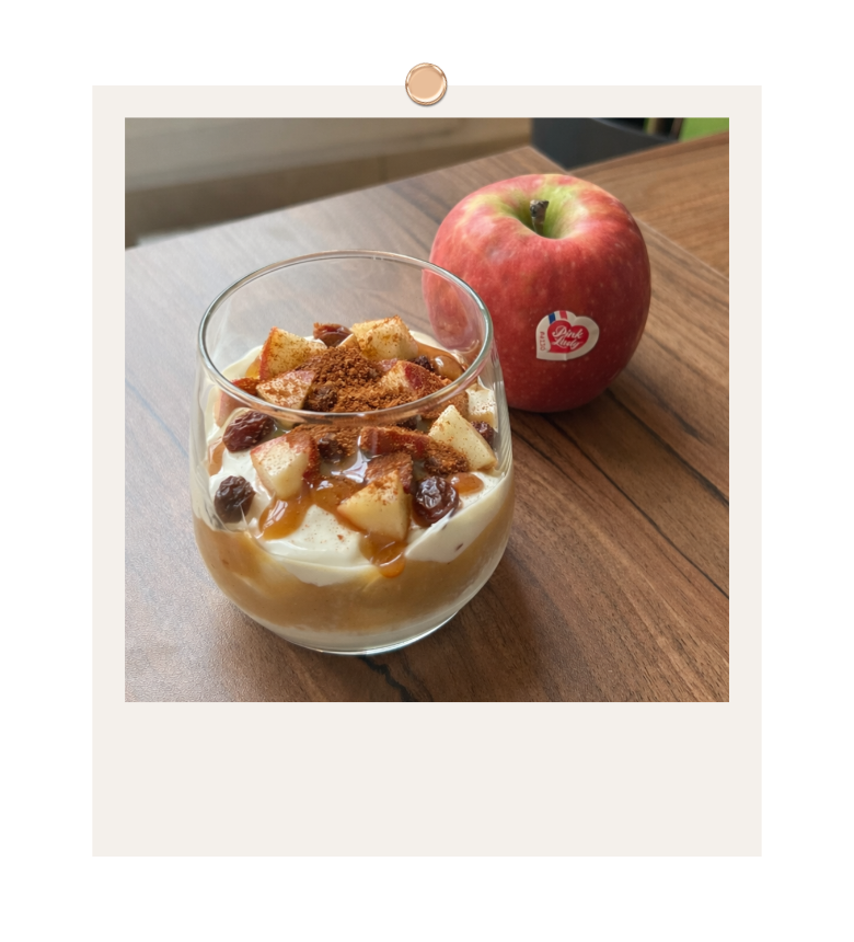 Pour réaliser cette recette c’est très simple ! Une couche de yaourt nature, une pomme Pink Lady® coupée en dés, un peu de cannelle et un filet de caramel, cette version « cinnamon rolls » est idéal pour entamer la journée du bon pied.