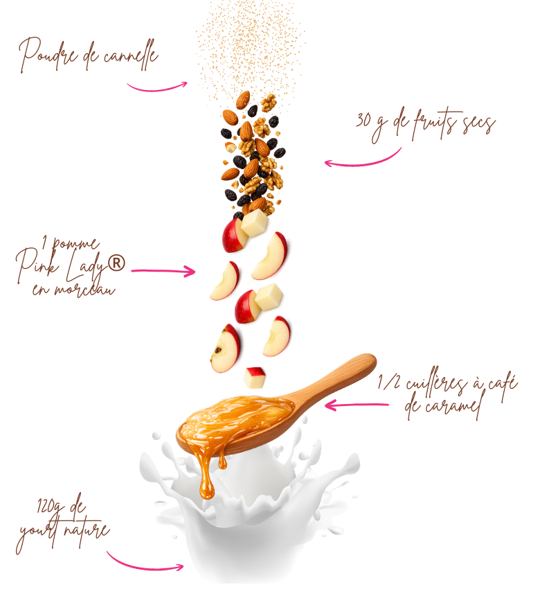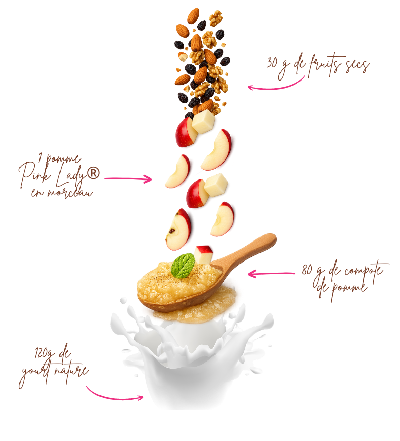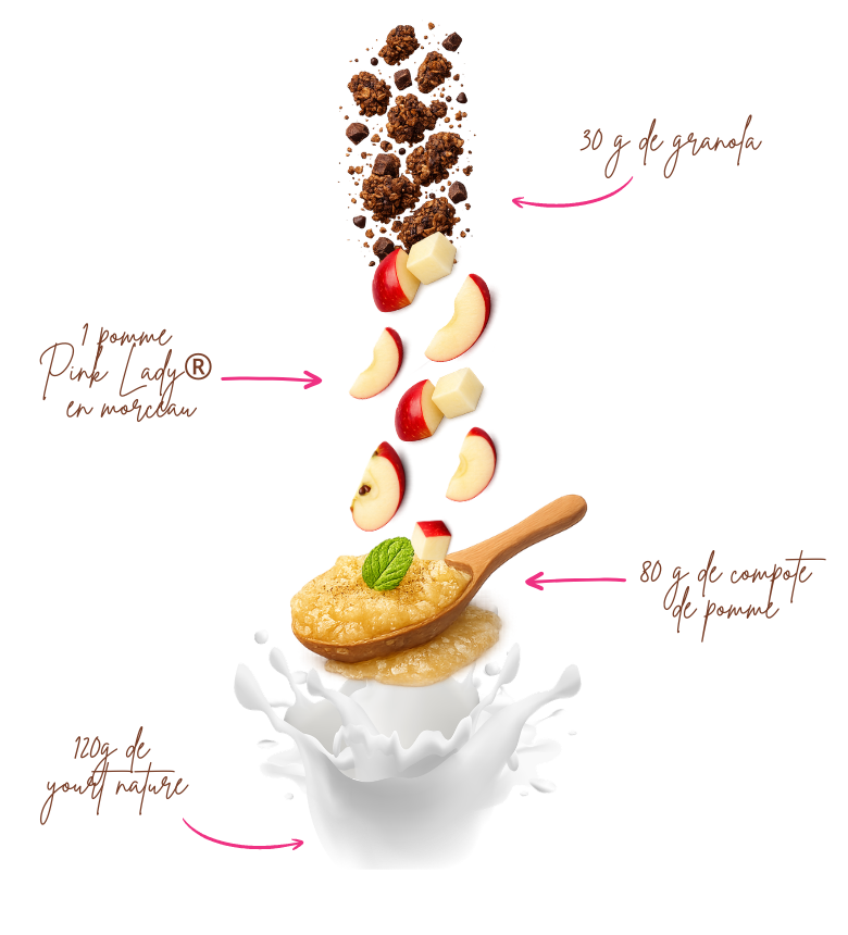 Pour le préparer, il vous suffit de couper votre pomme Pink Lady® en morceaux. Dans un récipient, superposez une couche de yaourt nature, puis de la compote de pommes faite maison ou achetée dans le commerce. Ajoutez ensuite quelques morceaux de pomme, puis terminez par une dernière couche de yaourt.