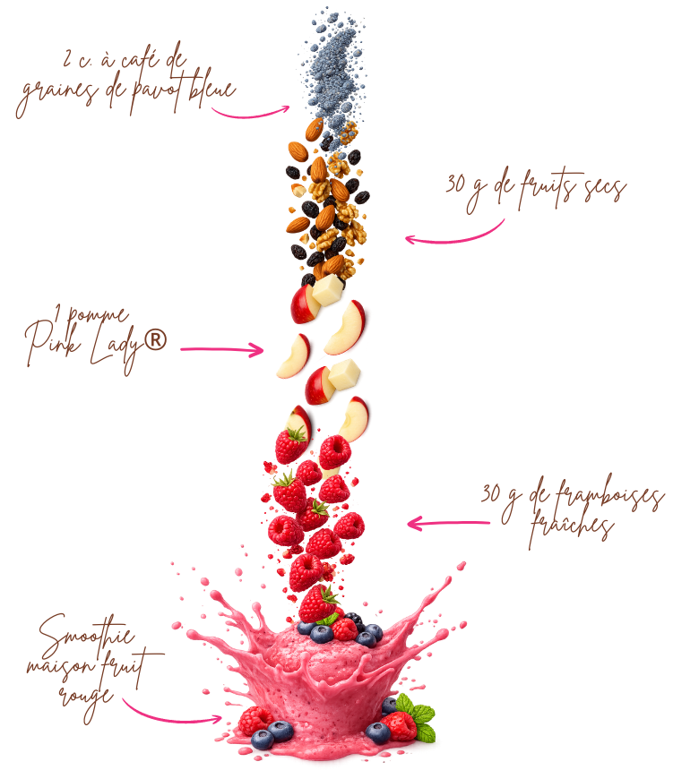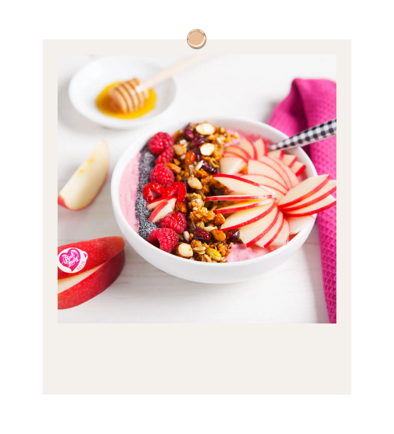 Envie d’un boost de fruit ? Optez donc pour ce smoothie bowl aux pommes Pink Lady® et fruits rouges !