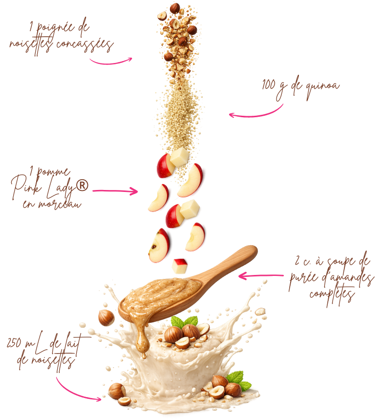 Le lendemain ou le matin même (si vous avez 5 min pour réaliser le porridge), accompagnez-le de pommes Pink Lady®, des noisettes concassées et d’une cuillère de purée d’amandes complètes. Dégustez puis filer à vos occupation ! 🍎
