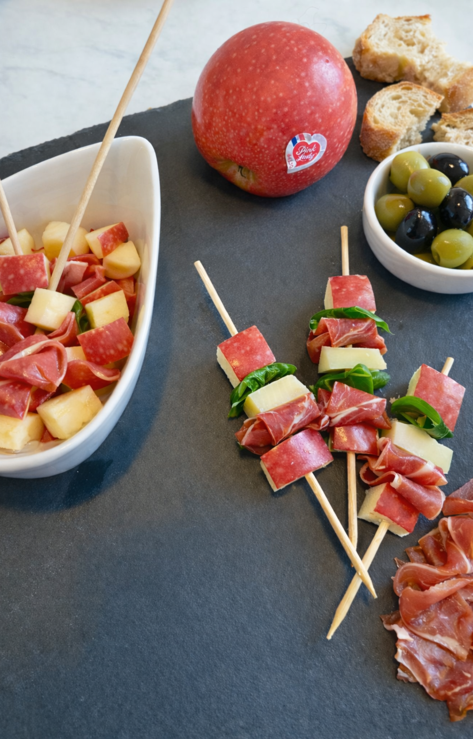 - Sur une brochette, superposez un morceau de pomme, un morceau de comté, une tranche de jambon de Serrano et de la roquette (ou de la mâche).