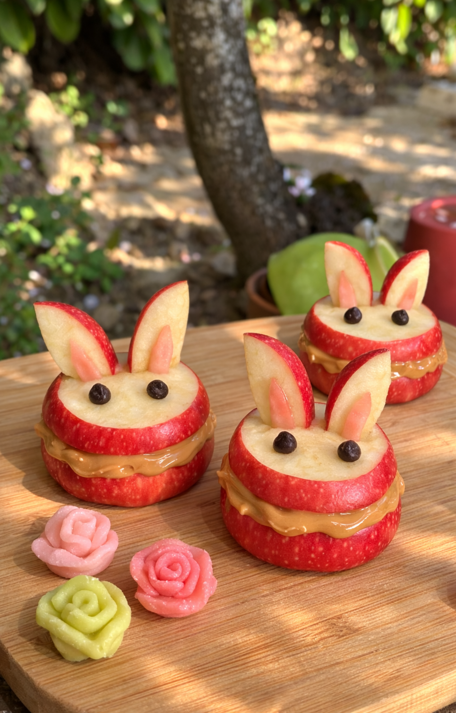 - Coupez des morceaux de pomme en forme ovale pour créer les oreilles du lapin et ajoutez un morceau de pâte d’amande pour finaliser l’intérieur des oreilles.